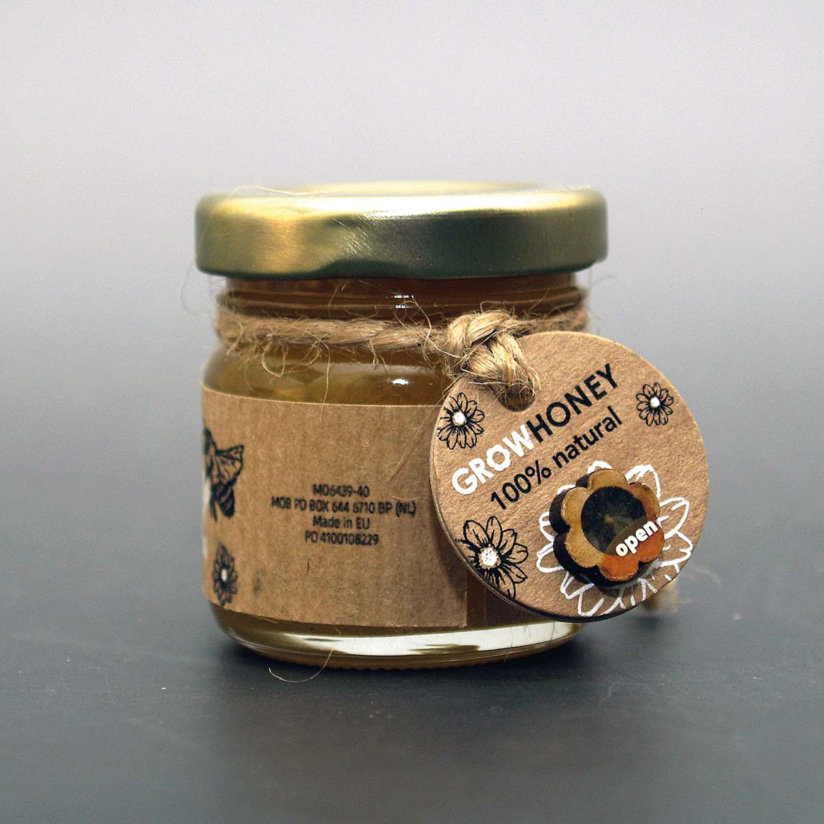 Kleines Wildblumen-Honigglas (50g) mit Blumensamen, um neue Honigquellen zu pflanzen. Gibt es auch mit Honiglöffel aus Holz oder als 3er Set (Wildblumen, Lavendel und Raps), jeweils mit Umkarton, der individualisiert werden kann.